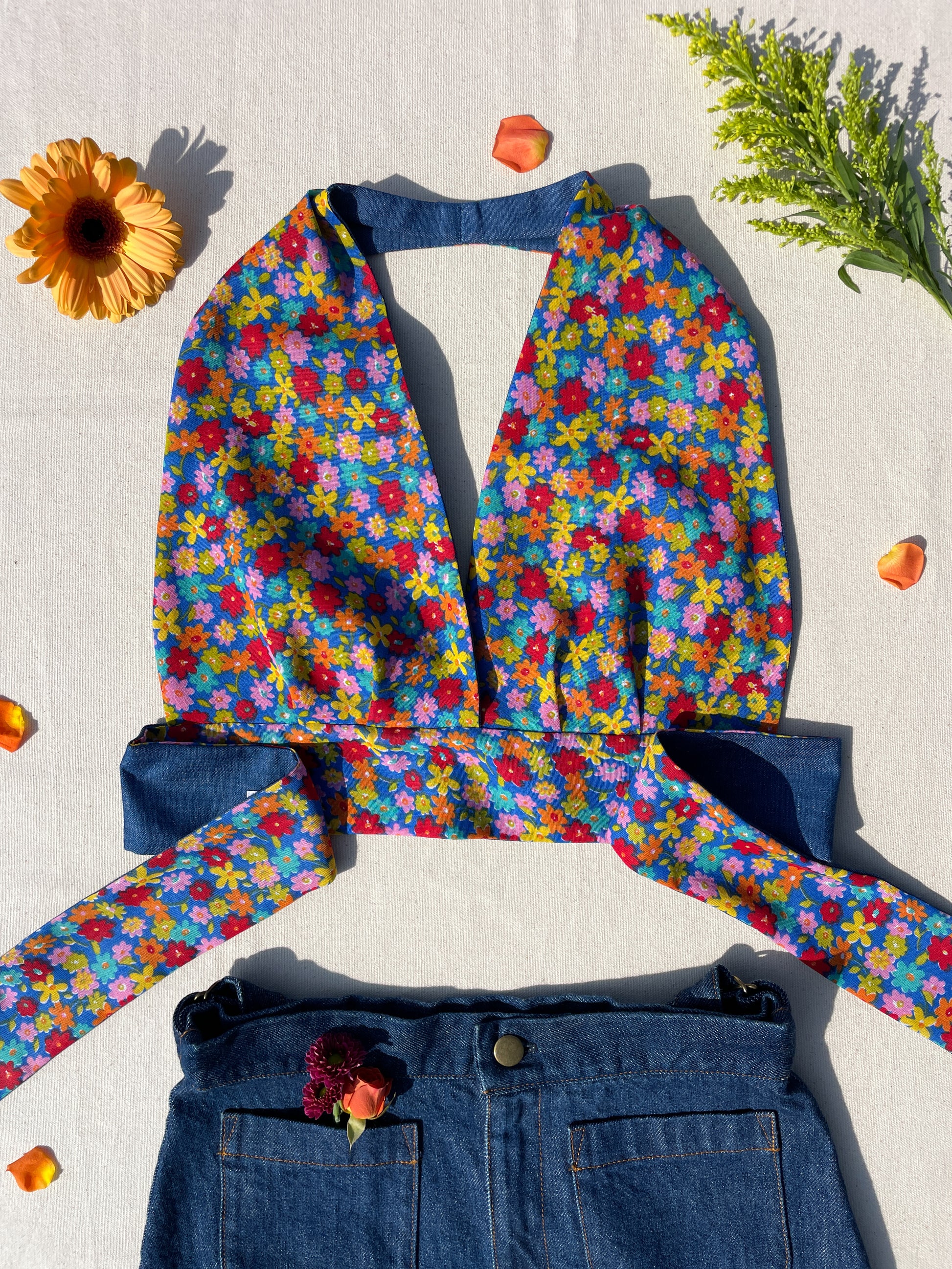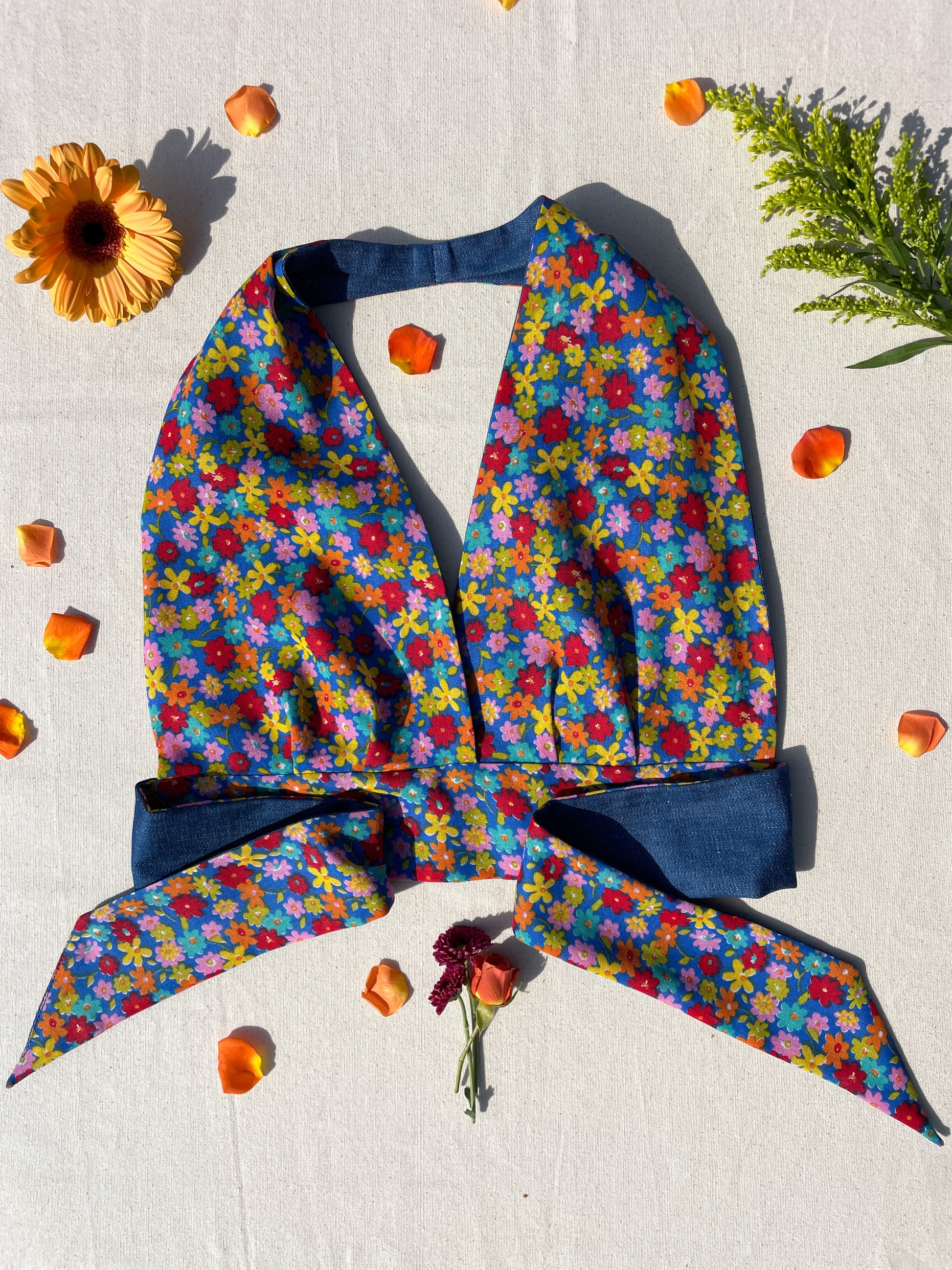 Reversible Halter | Blue multi flower & denim