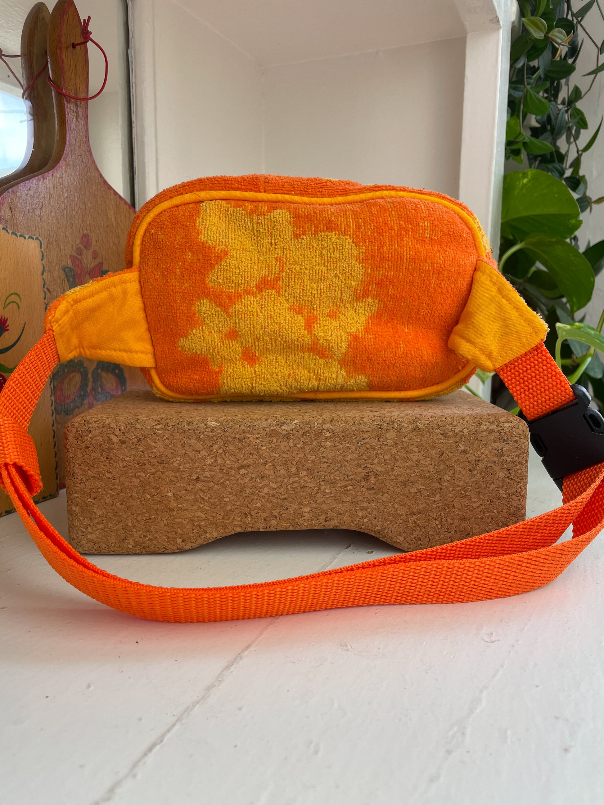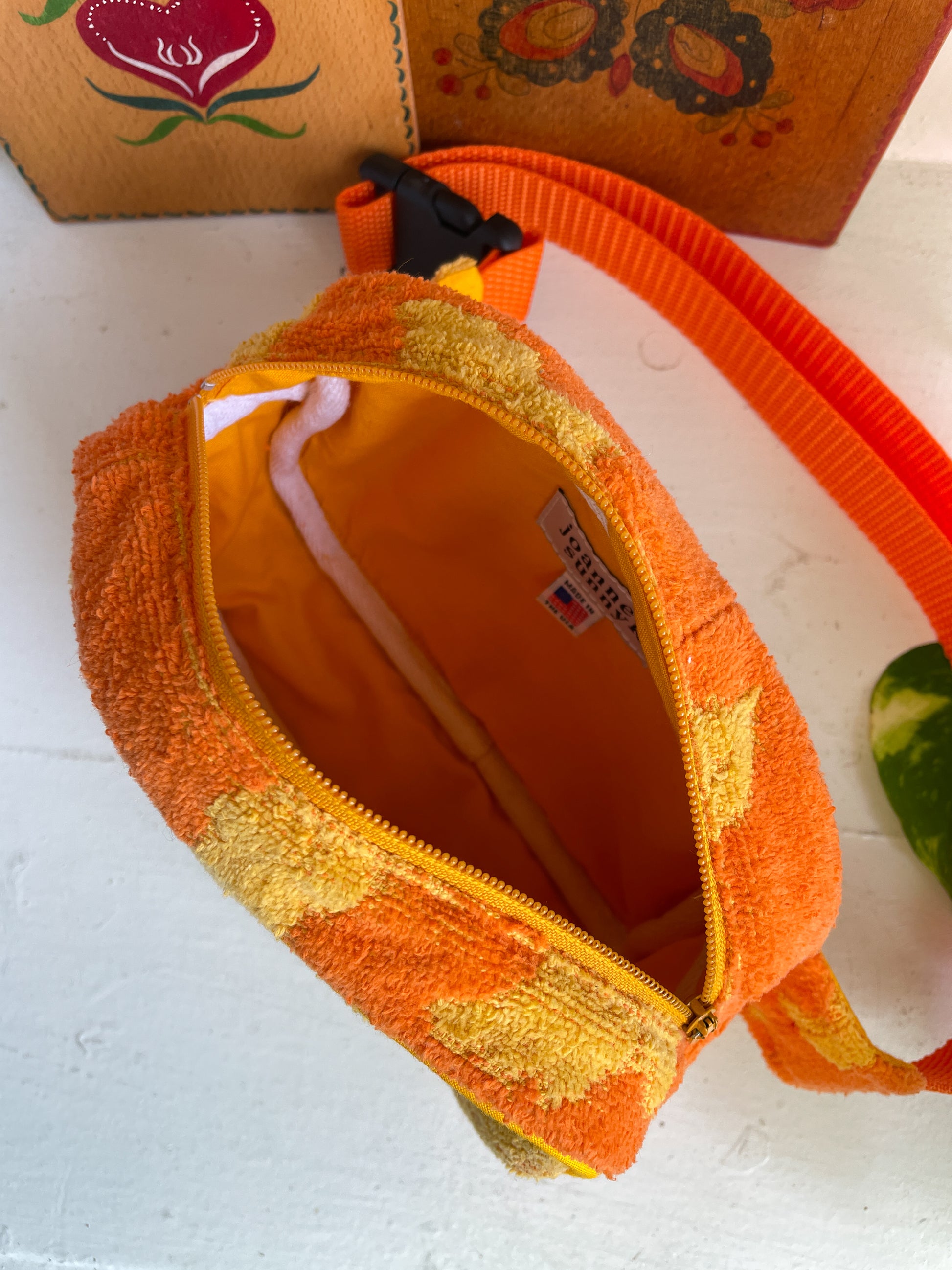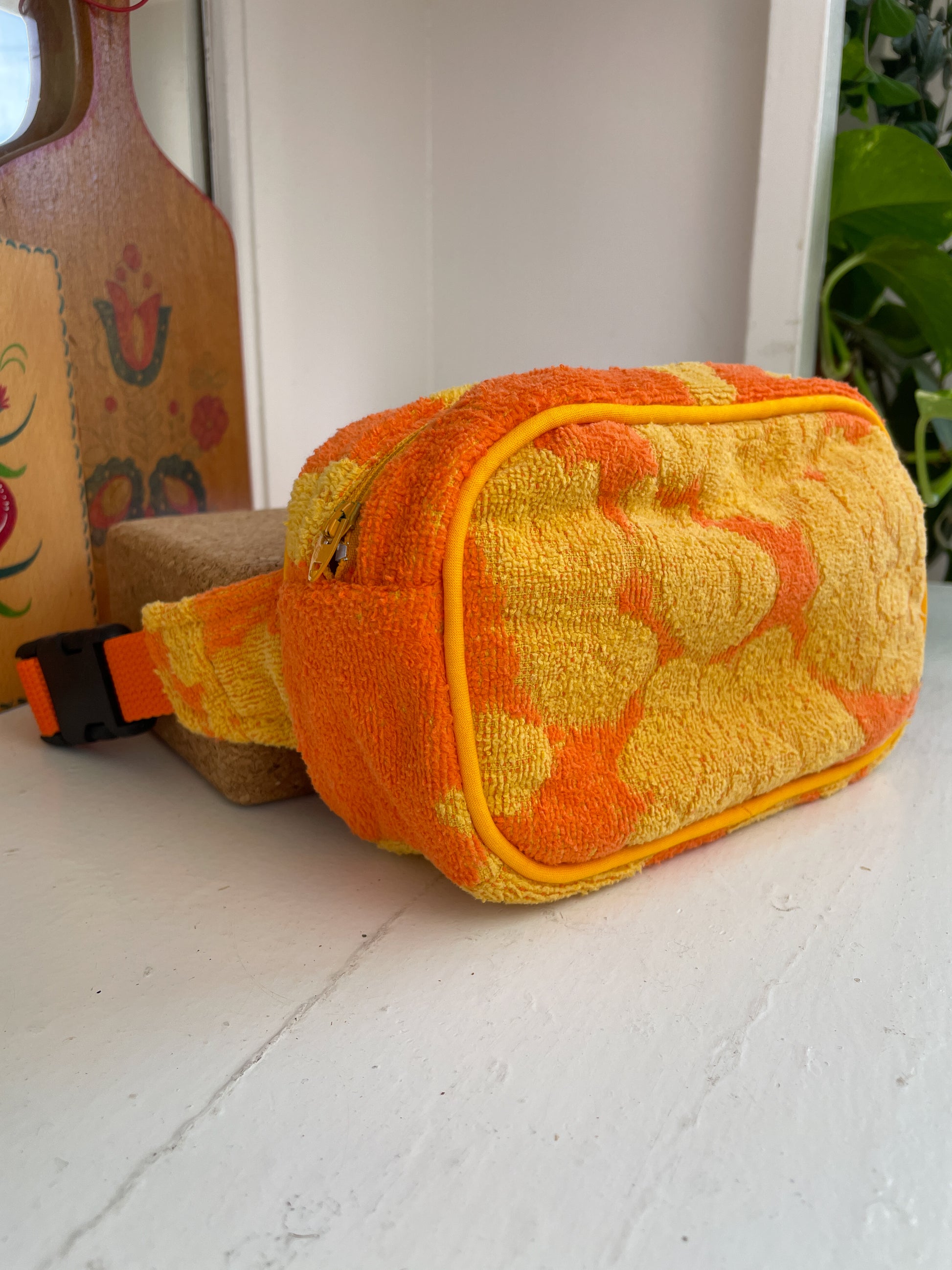 Upcycled vintage towel fanny pack with contrast pipping. Adjustable strap up to 42". Fully lined. Only 1 available!
